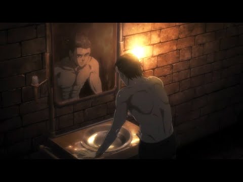 Eren looking at the mirror, new hairstyle - Attack on Titan Season 4 Episode 9 - Eren Jaeger Season 4 Hair Down